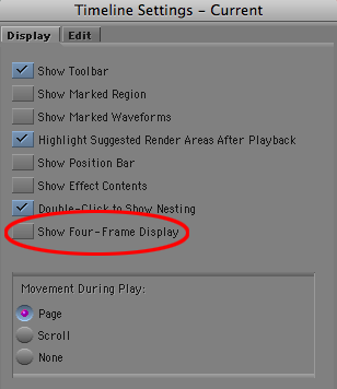 There used to be a way to suppress the four-frame display on a case by case basis. You held down a modifier key while you dragged and the images wouldn’t appear. We seem to have lost that in Version 5, but you can still turn off the four-frame display with a setting. You’ll find it in timeline settings. Deselect “Show Four-Frame Display” and you may find that timeline dragging is a lot more responsive.