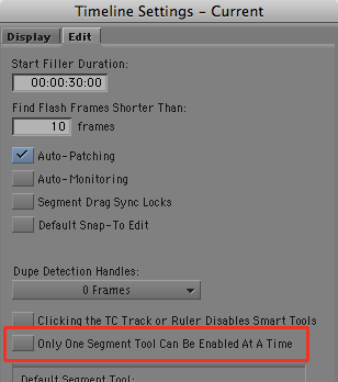 For some people that’s more flexible, but if you prefer the old way, you can now have it via a selection in the Edit tab of Timeline Settings: “Only One Segment Tool Can Be Enabled At A Time.” Turn it on and you’ll get the Segment Mode of your choice — but when you turn one on, the other goes off.
