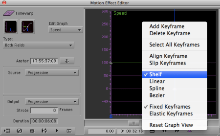 Move the position indicator to your frame and add a keyframe. Then — and this is the crucial step — right-click on the speed graph and select “Shelf.”