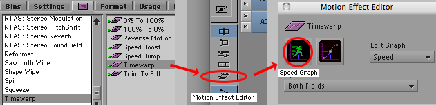 First, identify the frame to freeze and add a locator so you can find it easily. Then drag the Timewarp effect to the clip, park on it, open the Motion Effect Editor, and display the Speed Graph.