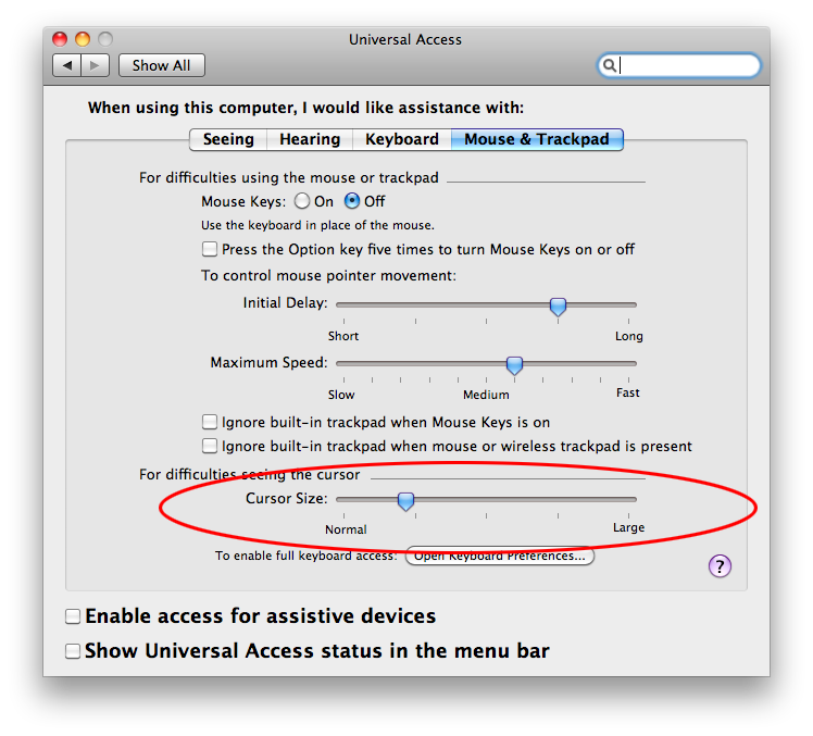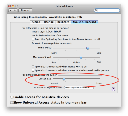 Though many people don’t seem to be aware of it, you can easily change the cursor size with an OSX control panel. Go to System Preferences > Universal Access > Mouse and Trackpad Tab. You’ll see a Cursor Size slider. Bump it to the right and your cursor will get a whole lot easier to locate. It’ll look a bit more aliased, but that’s a small price to pay for greater usability. (You can do the same thing in Windows with the Mouse Control Panel.)